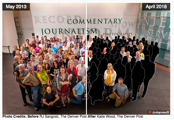The caption under the photograph states: "On May 15, 2013, The Denver Post's newsroom staff gathered for a photograph after winning a Pulitzer Prize for its coverage of the Aurora theater shooting. This photo illustration shows the toll that layoffs and constant turnover have taken on the paper's staff since then. On Monday, at least two dozen more journalists will be leaving the Post because of layoffs. RJ Sangosti, The Denver Post"