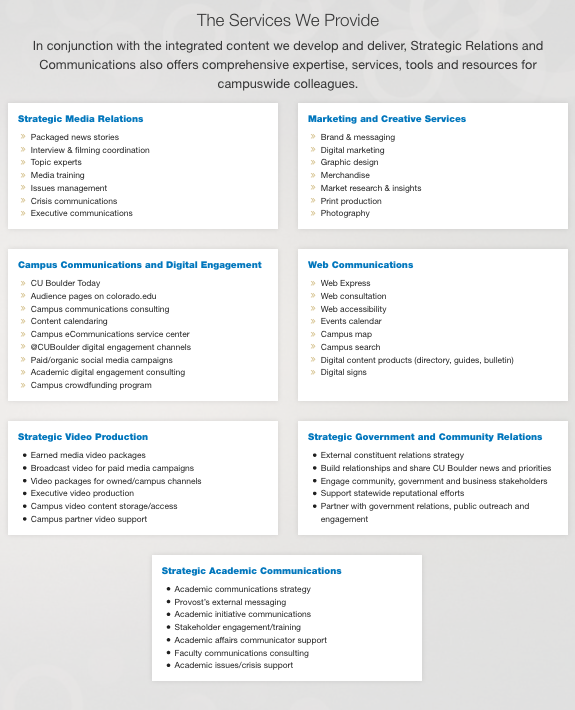 "Across our campus - and throughout the university - editors, programmers and project managers have spent untold hours retooling the electronic infrastructure, policies, and editorial strategy to present a new face of electronic communications for the University of Colorado Boulder. The result is a suite of three new electronic communication systems for telling the stories of our community and promoting the life of the university in engaging ways."